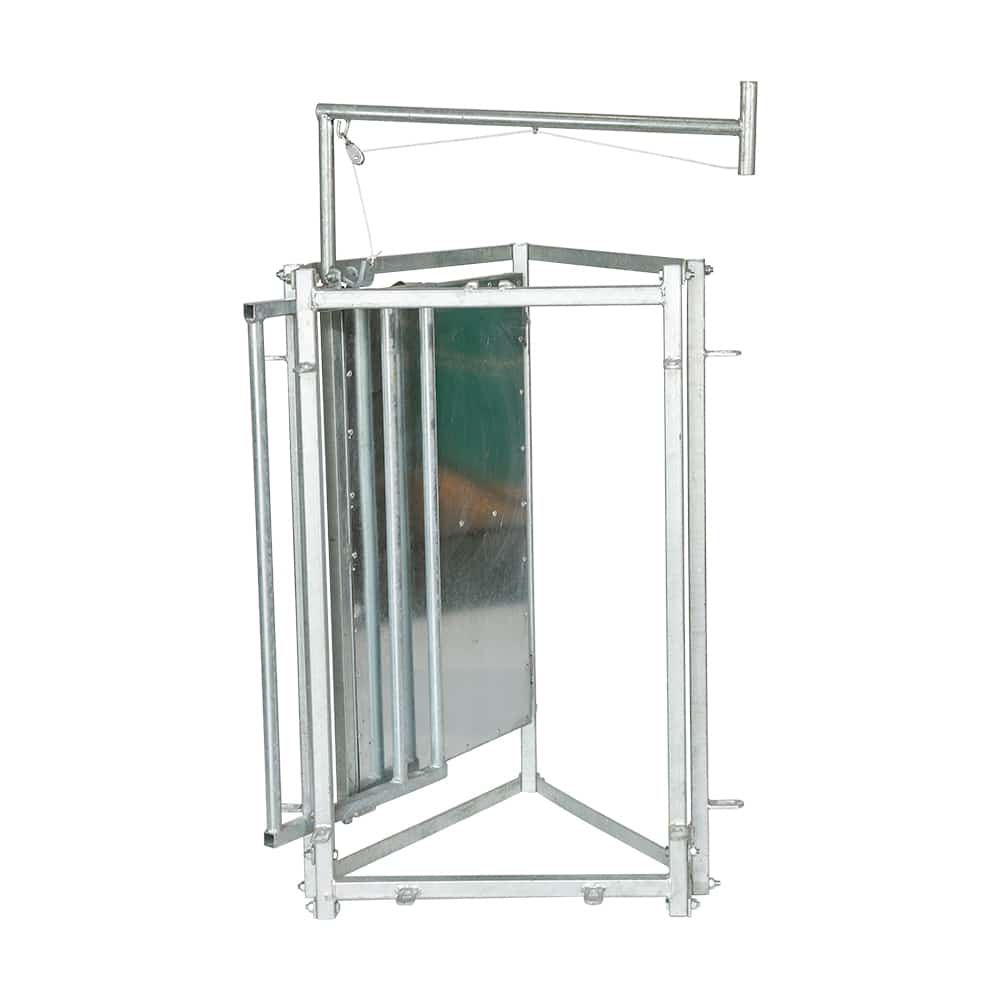 Has a center panel that folds flat when sorting left or right, but in neutral position folds out flat to create a stop. The operation of the sorter is done via a 30″ handle, which has a trigger to lock and unlock the sorter. The handle keeps you well away from the sorter so animals exit better. Also supports your raceway panels at the proper angle and width.